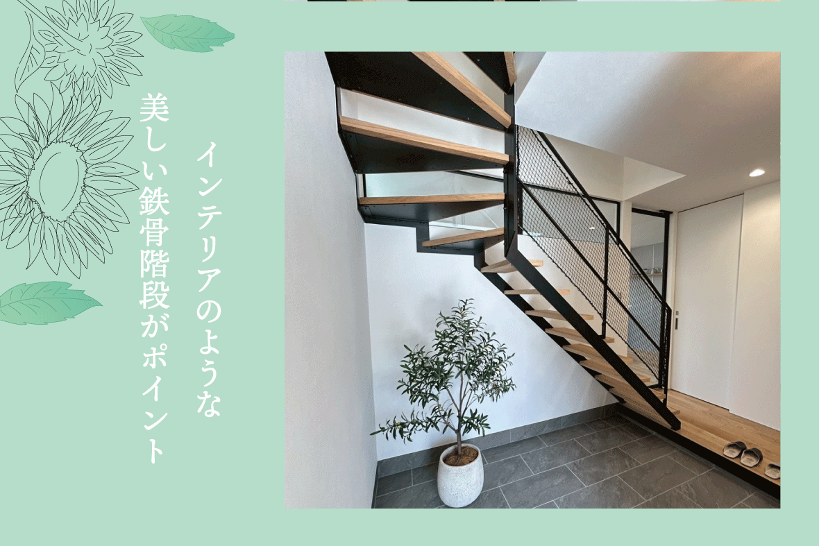 暗くなりがちな玄関土間スペースを明るく広く仕上げました。入って直ぐ目を惹く鉄骨階段は、他にはないアートの様に美しい!
