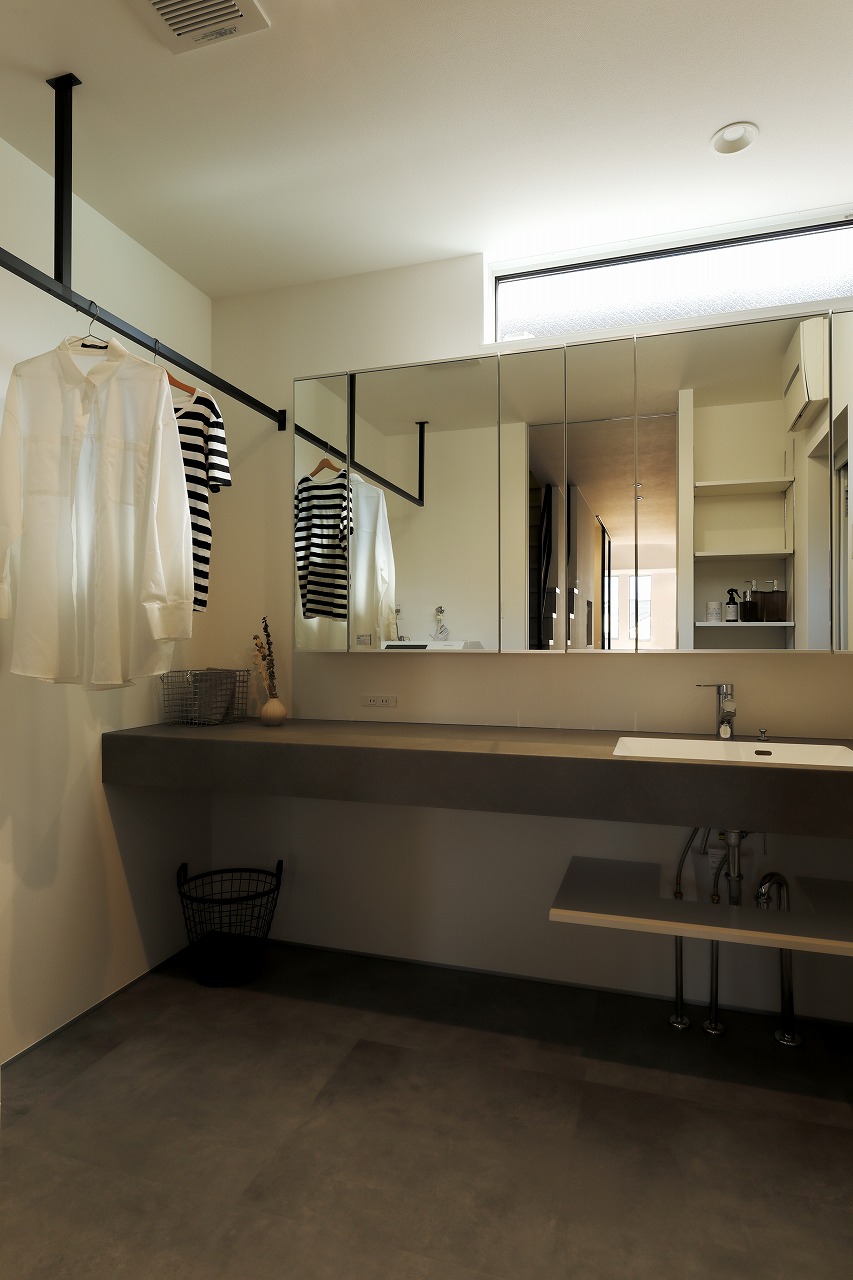 朝の身支度と洗濯が重なってもストレスが少ない、ゆとりある洗面脱衣室。