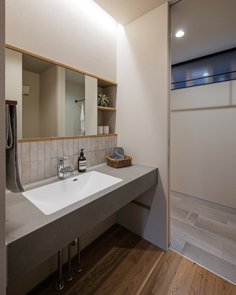 造作洗面台と脱衣室を分けることで、