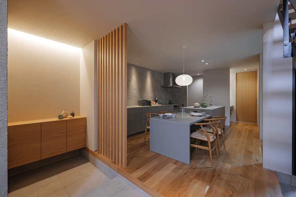 石目調キッチンと木製建具がつくる、落ち着きのある空間