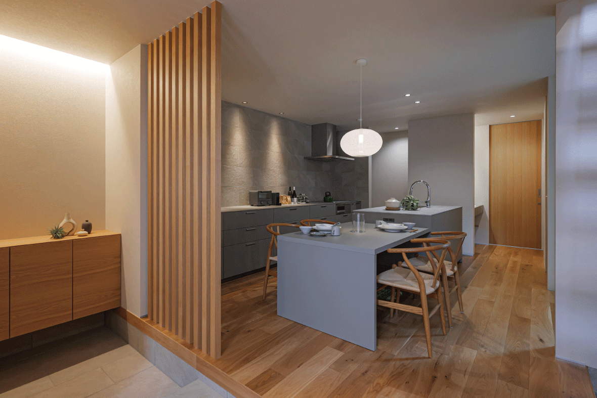 格子のやさしい存在感がほどよい区切りをつくるダイニングキッチン。