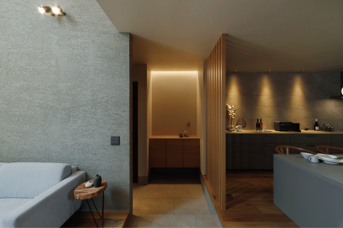 照明や壁のデザインや床をちょっとした工夫で、まるで旅館のような落ち着きがある、ゆったりとくつろげる雰囲気に。