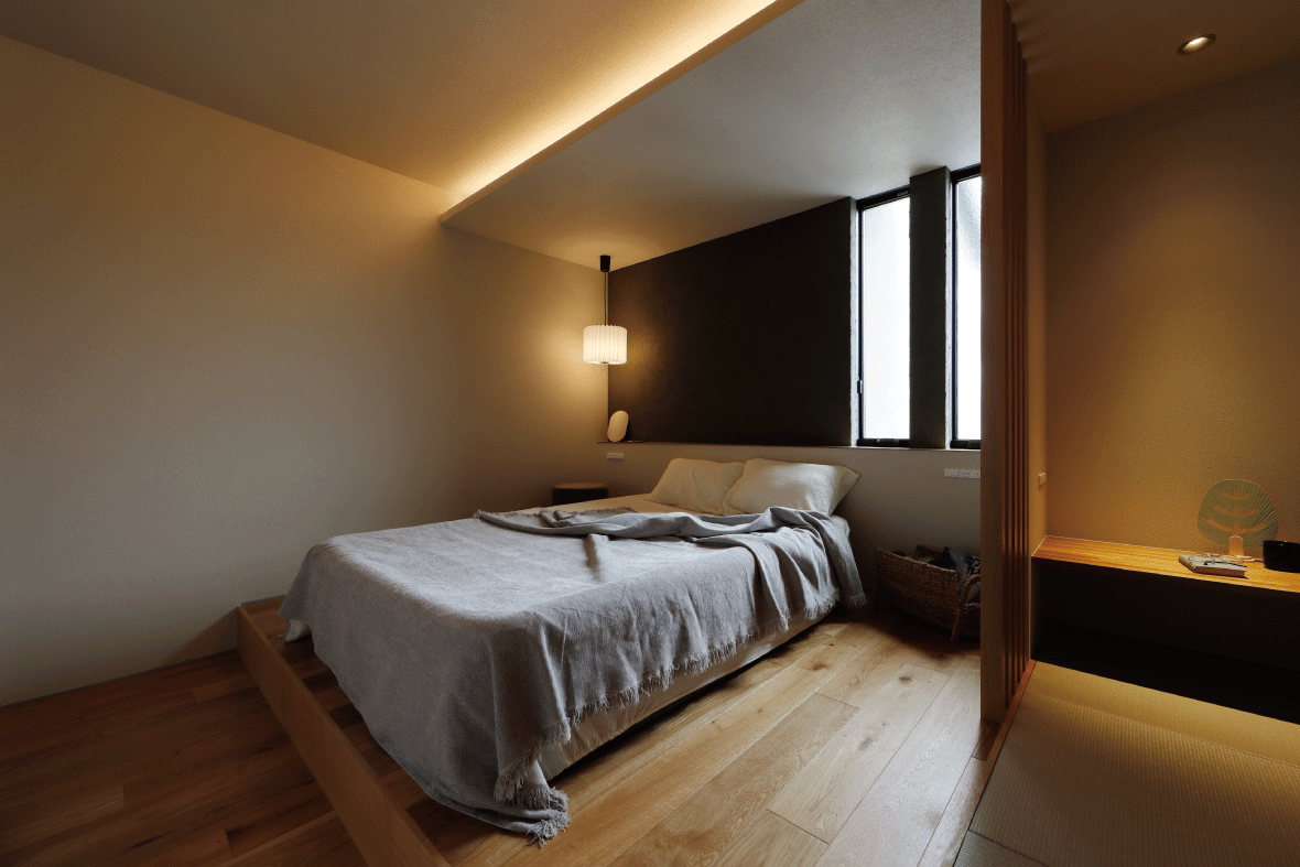 照明や壁のデザインや床をちょっとした工夫で、まるで旅館のような落ち着きがある、ゆったりとくつろげる雰囲気に。