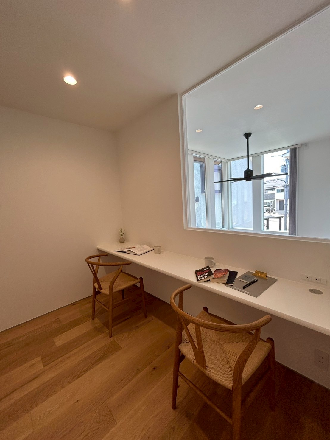 2階には、勉強や在宅ワークにぴったりのワークスペースを設けました。室内窓越しにリビングが見えるから、安心感がありながら集中できる場所です。