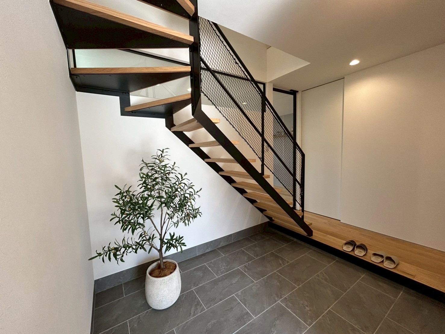 玄関の鉄骨階段には、転落防止ネットをプラス。