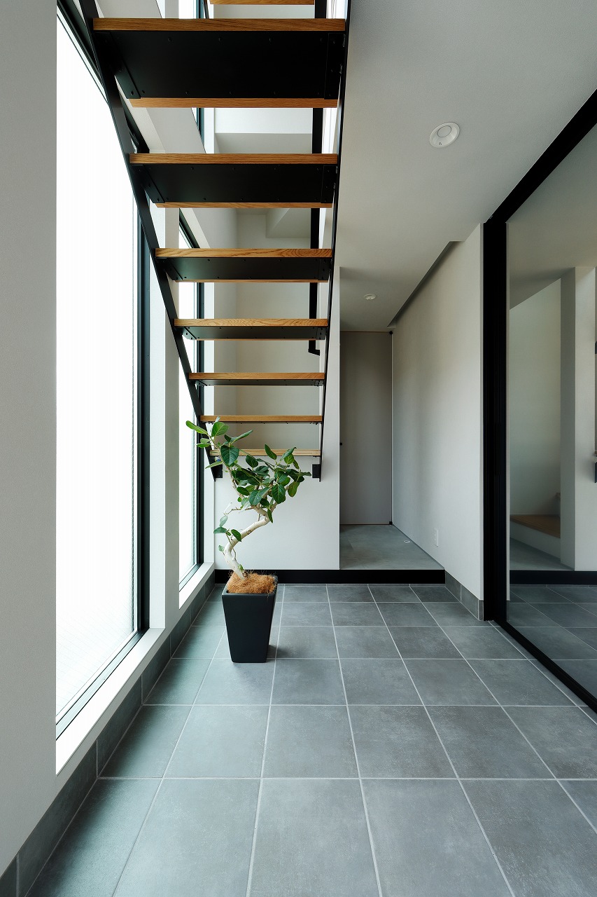 アイアン階段が映える、開放的な玄関の家