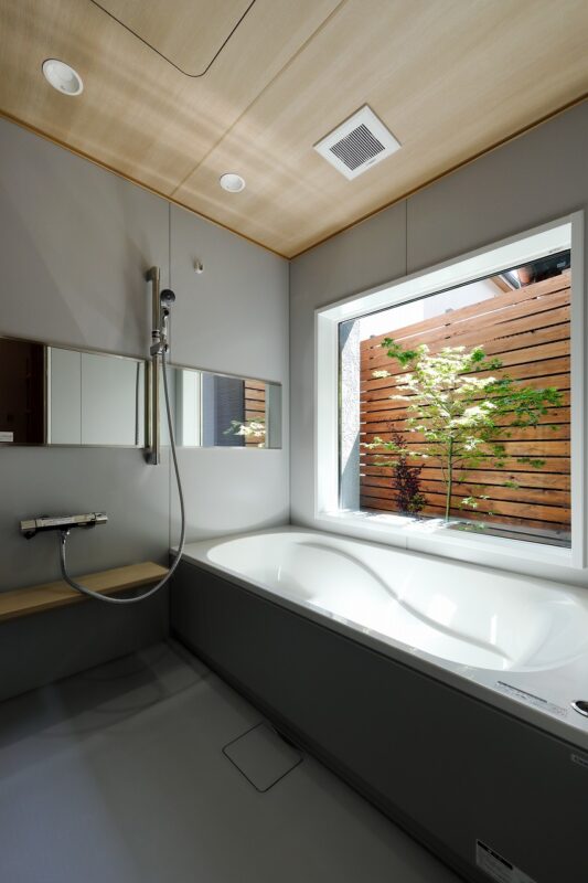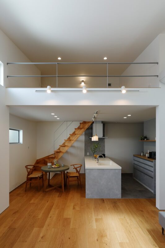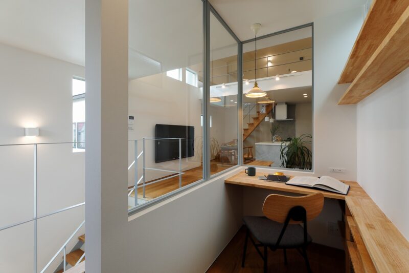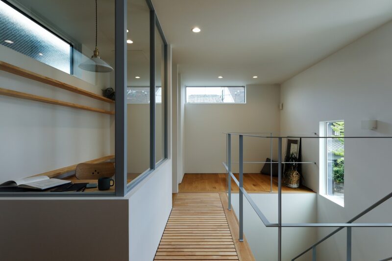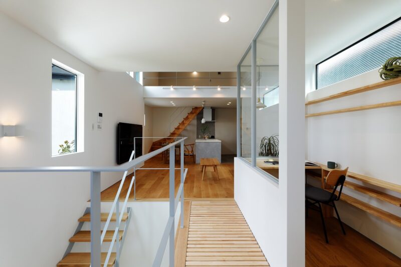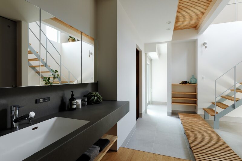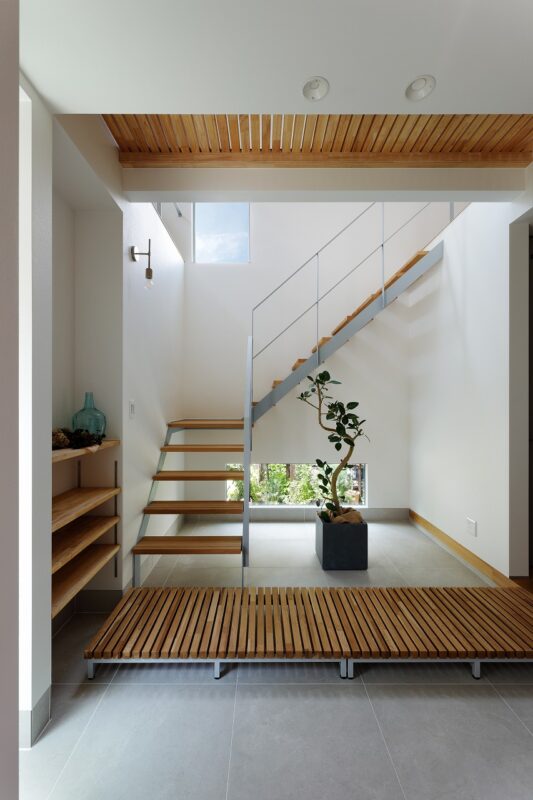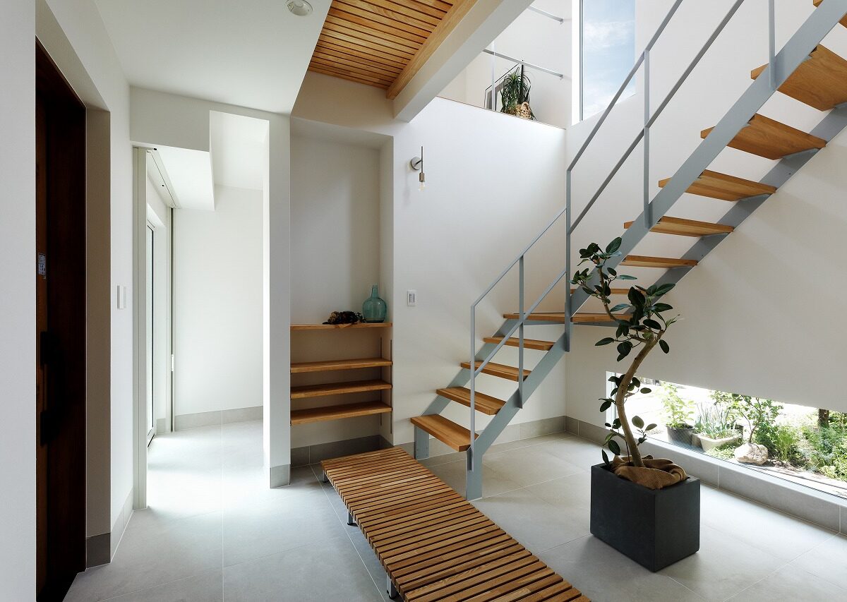 造作すのこと鉄骨階段、地窓の緑が映える玄関