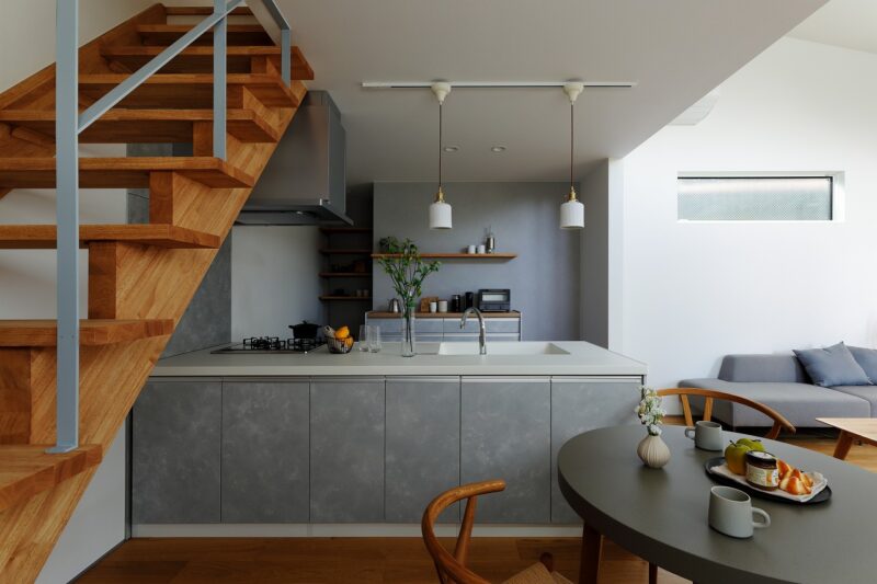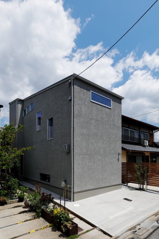 グレーの塗り壁が際立つ、シンプルモダンな外観