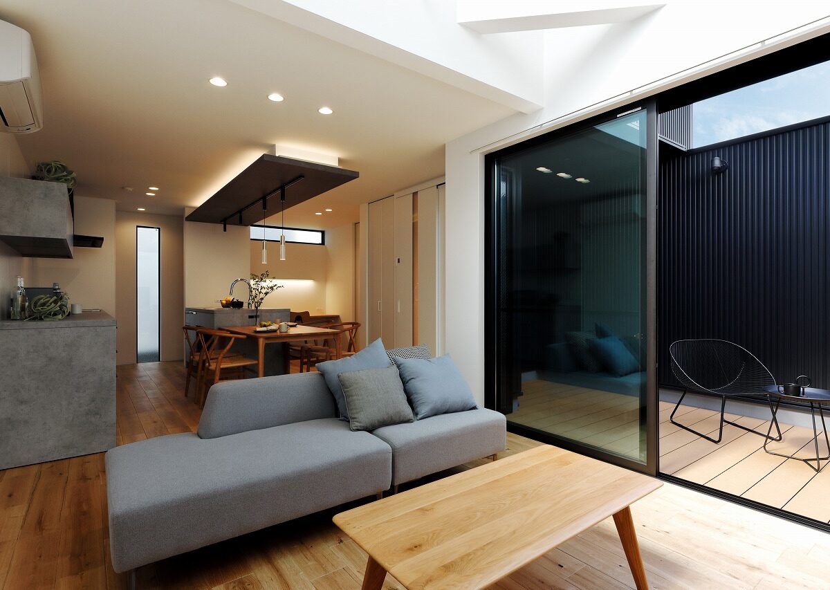 存在感ある黒い金属サイディング外観が魅力の3階建て