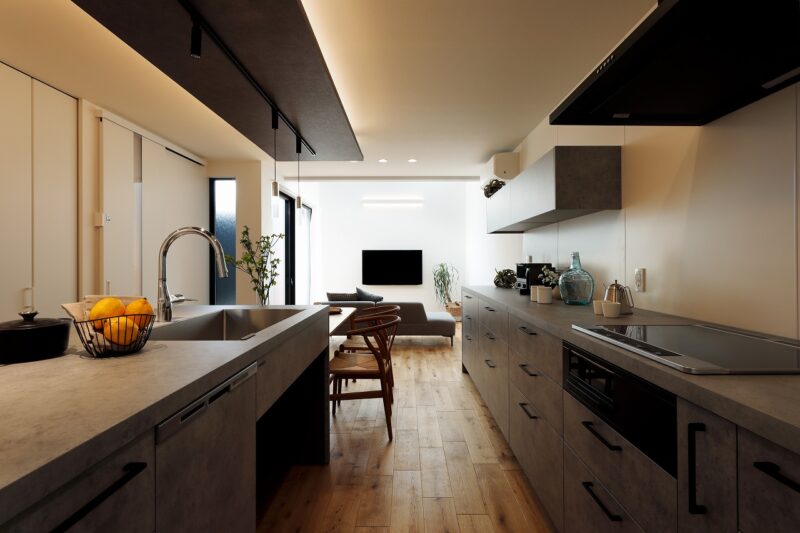 おしゃれなグレーキッチンと家事楽な横並びダイニング