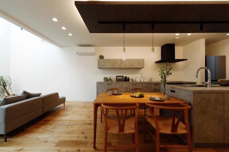 下がり天井と間接照明が彩るおしゃれなキッチン空間